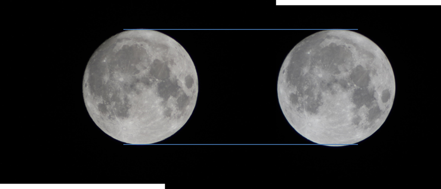 The figure’s left image was taken after moonrise, at about 6 p.m. local time when it had cleared the local, mountainous horizon. The right image was taken with the Moon near its maximum altitude that night, at about 12:30 a.m. The lines across the pair of images show the apparent difference in size: The rising moon is smaller because it was further away when it was rising. At that time, the Moon’s center was about the same distance from Earth’s center and from the observer. At the time of the second picture, Earth had rotated about a quarter-turn and the Moon was highest in the sky. At that time it was almost 4,000 miles closer to the observer because Earth’s rotation has carried the observer more directly under the Moon; Earth’s center was now farther from the Moon than the observer was. Except for the small change in distance between their centers due to the Moon’s orbital motion in those 6.5 hours, the observer’s decrease in distance from the Moon is demonstrated by the pair of photographs.